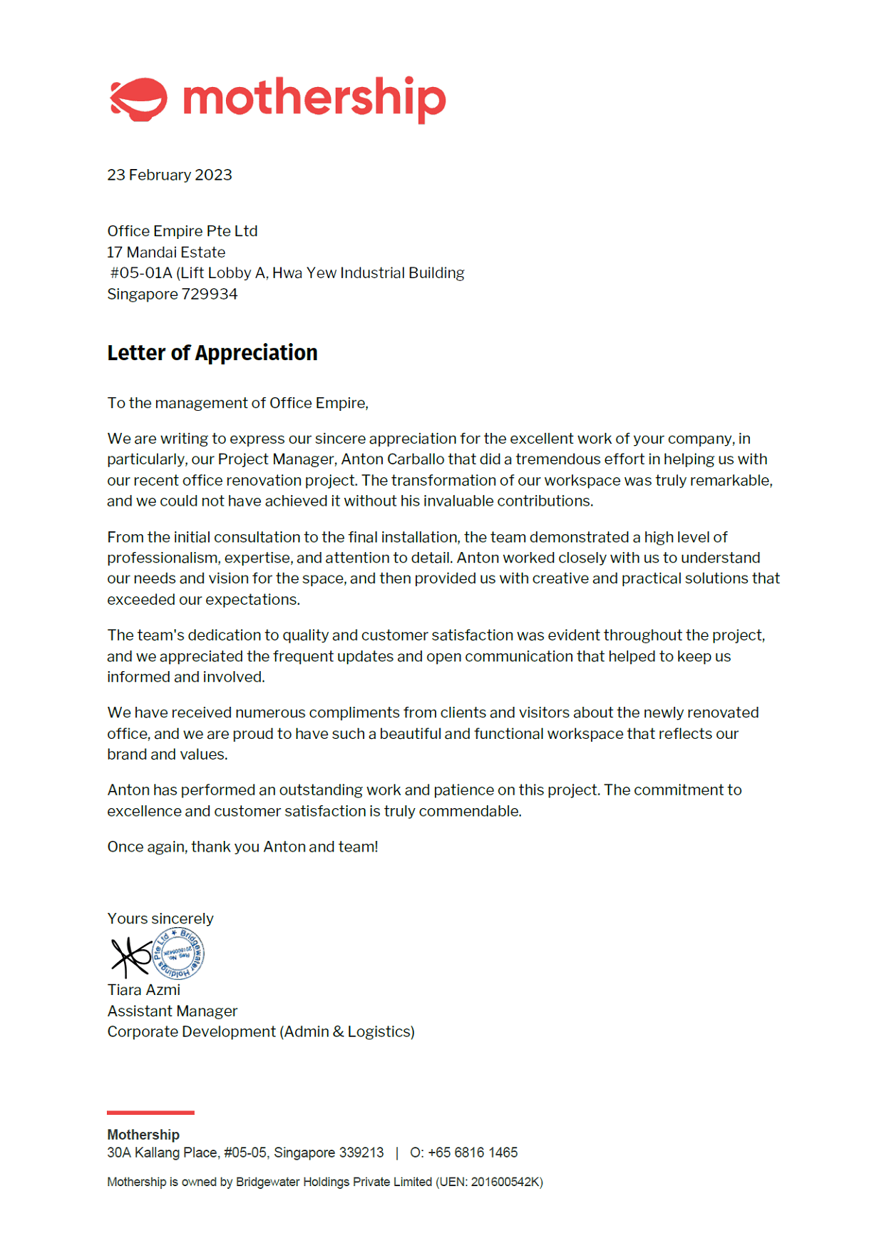 Bridgewater Holdings Private Limited (Mothership)